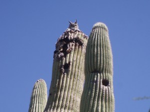 with PEOPLE? We have a Great Horned Owl living in the top of a saguaro with her two babies at the end of our cul-de-sac. Wow, hard to believe that she took up residency here in our little community. She probably should have chosen the gated community just a tick down the road. She is the object of massive attention from the neighborhood, media and passersby. She doesn’t seem to mind most of the time and nearly everyone has been respectful until yesterday. Some well-meaning (I’ll give them the benefit of the doubt) numbskull decided that the owl family who are exposed to the hot afternoon sunshine (averaging in the high 80’s lately) needed shelter. Somehow the daredevil numbskull ascended to the top of the prickly saguaro (20 +/- feet) with cardboard and duct tape and made a tacky screen sticking up above the west side of the cactus. What? Like Great Horned Owls haven’t been making nests in the desert cactus for, oh, let’s say a few hundred years? They need a no