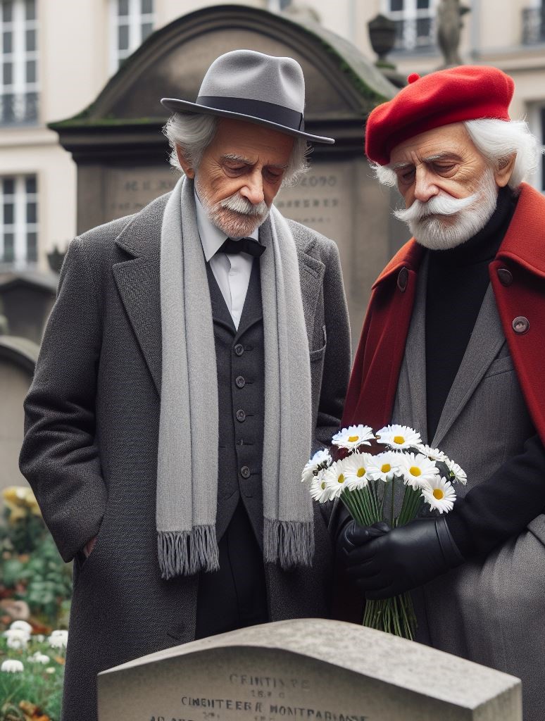 Twenty years went by, Phillipe and Gerard met one day at her grave in the Cimetière du Montparnasse. They eyed each other but didn’t speak. After several chance meetings, a coincidence neither of them questioned, they began a conversation about her. They assumed she intentionally brought them together. As time went by their meetings were formalized every Thursday at 12:00. When they met, they shared stories about how she enriched their lives. Each revealed a different side of her. To Gerard, she was a daring acrobat, lithe and supple, a physical wonder. To Phillipe, she was a cerebral partner with ideas flowing from her inventive mind.  It made them feel that she was still with them. They alternated taking flowers to her grave. Occasionally both took flowers when a specific memory was observed by one or the other. After a while, they began eating breakfast at the same café, but never spoke except on Thursday. Their only subject was of her.