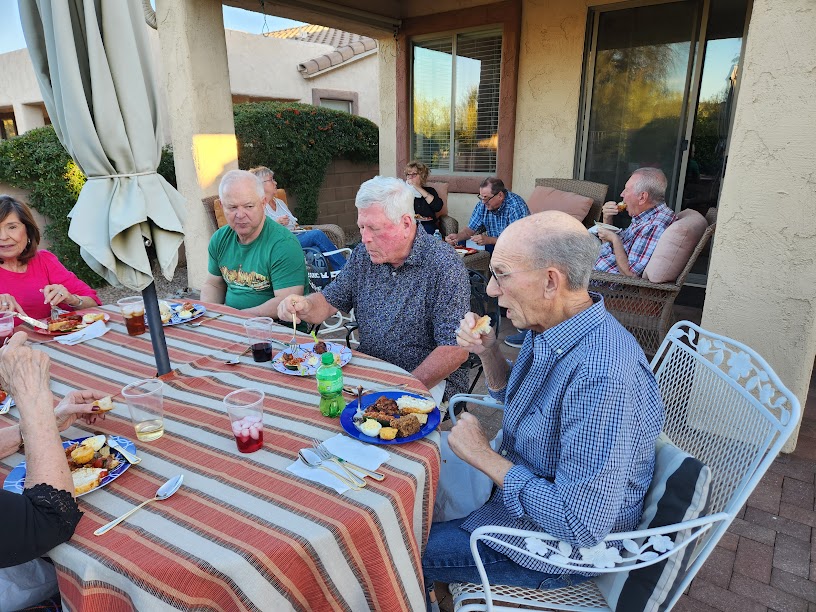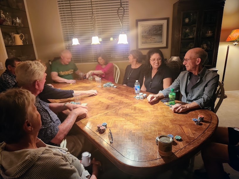 On November 5th we hosted a pot-luck Texas Hold ‘Em poker party for a group of long-time friends. We ate outside on the back patio then went in for the card game. Our poker parties go back many many years. As couples, we used to meet regularly. When covid hit the parties became sporadic but we still met on occasion. In total, there are seventeen of us. Not everyone makes every party, but we try. The ladies of the group also gather monthly for dinner at a restaurant to celebrate a birthday. When there is no birthday that month we meet anyway to celebrate friendship. In October there was a garden party hosted by a couple who built a greenhouse during the pandemic. The incentive for that gathering was to show all the beautiful plants and vegetables they propagated during the last two years. Everyone left with a small basket of fresh veggies to make soup at home.