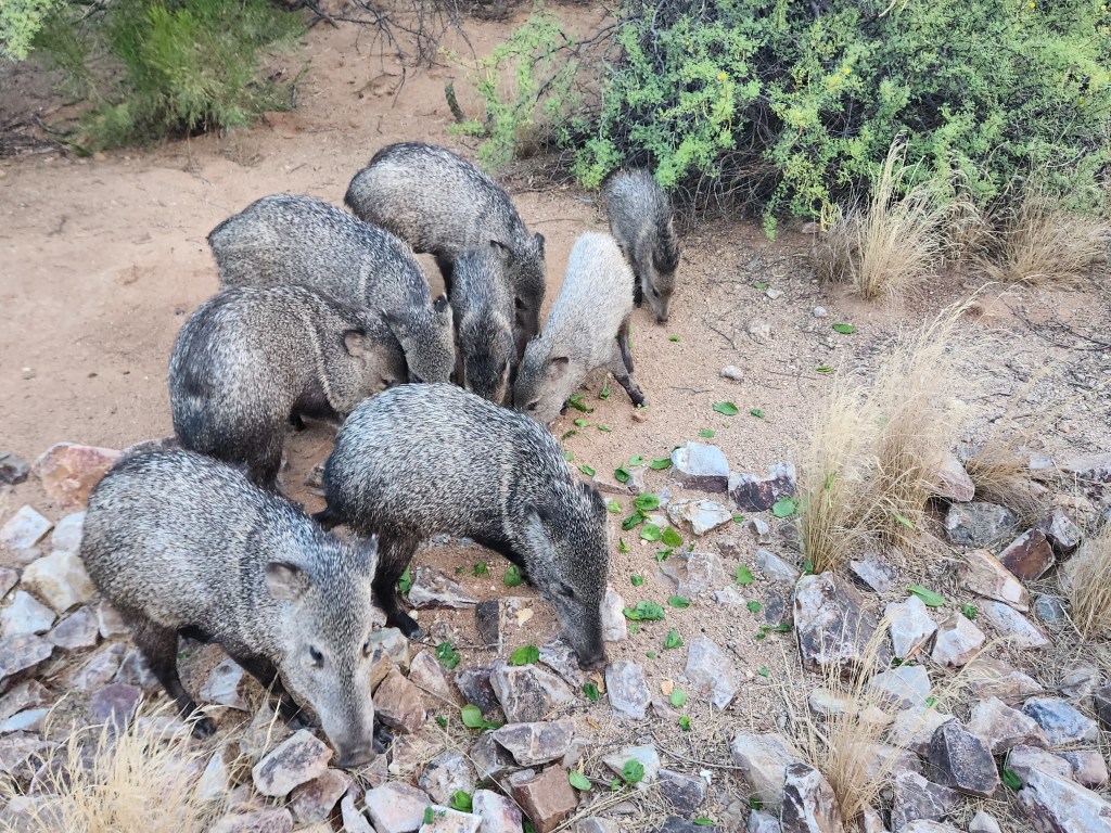 Bunnies become fat and sassy. Therefore, the coyotes have wonderful feasts and fill out their bellies as well. Plump quail parents shepherd their tiny eggs-on-legs babies across the path. Snakes are out warming their cold blood along paths and walkways. Best to avoid them although most are harmless. We do have the occasional rattler. Happy lizards and geckos of many types skitter through the brush. I stop to take photos of any cooperative critter. Javelina are most amenable to pose for me, so I have scores of javelina family photos.