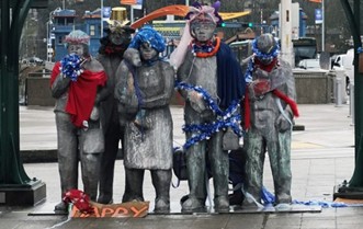 Fremont is the artist community of Seattle. It is sometimes called the People’s Republic of Fremont, and their motto is “De Libertas Quirkas,” which means, loosely translated, “the freedom to be quirky”, I think. A sixteen-foot statue of Lenin was bought by a resident of Fremont after the fall of the communist government in Czechoslovakia. It was installed in the Fremont neighborhood in the 1990s. Another sculpture called “Waiting for the Interurban” stands in the middle of a thoroughfare near the Fremont Bridge, where no public buses pass. It is six people and a dog with a human face waiting for public transportation. The people of Fremont dress the sculpture inhabitants appropriately for the seasons – Hawaiian shirts or scarves and mufflers.