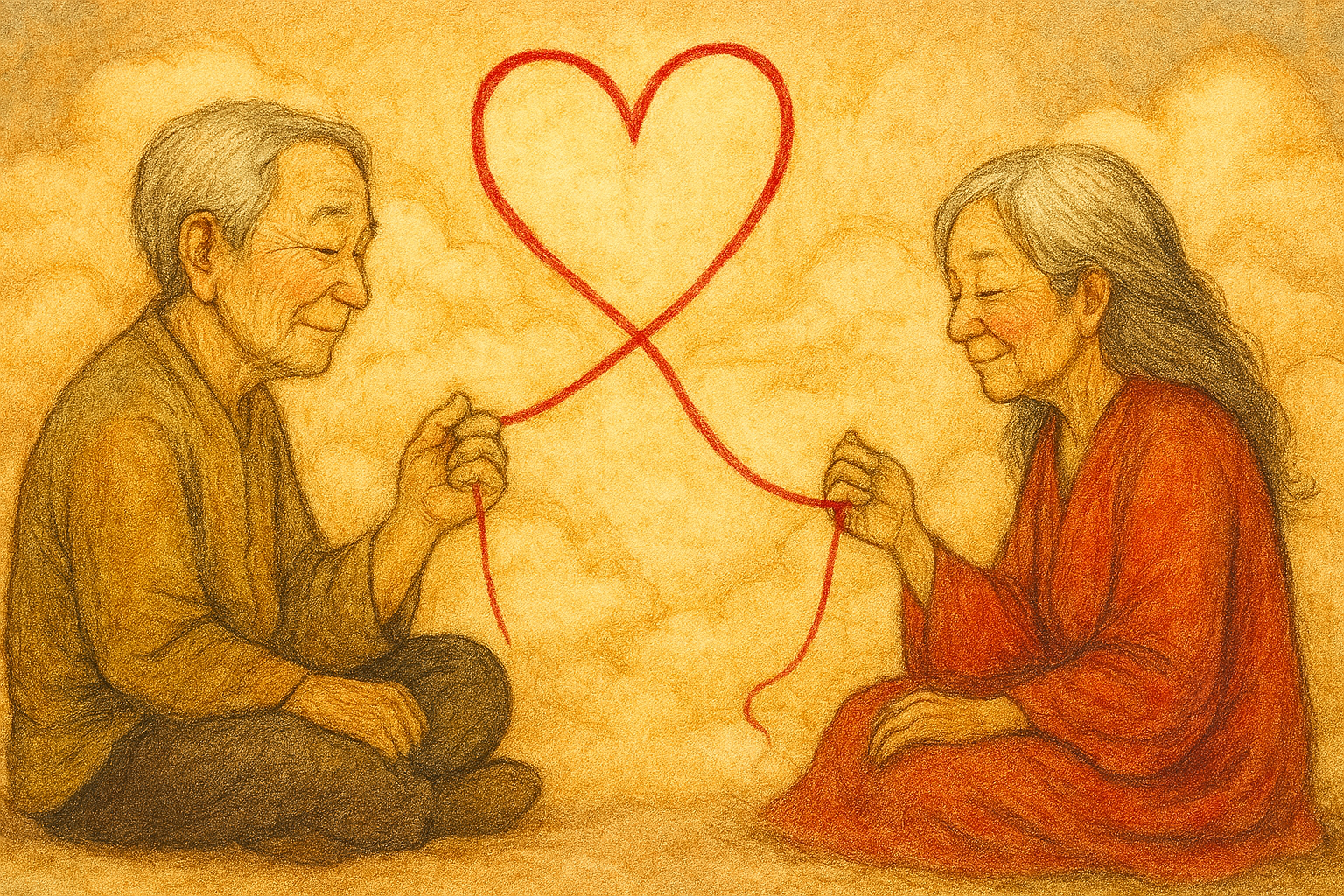 There is an ancient East Asian mythology about love and destiny. It is believed that a lunar god ties an invisible red string around the ankles or little fingers of two people who are predestined to be lovers. The string may stretch or tangle, but will never break because their soul connection has been foretold by the god. Despite challenges and distance, the string will pull these two people together at some point in their lives for a deeply rooted relationship as soulmates. Different versions of this story can be found in Chinese, Vietnamese, Korean, and Japanese cultures.