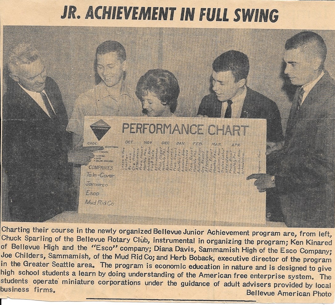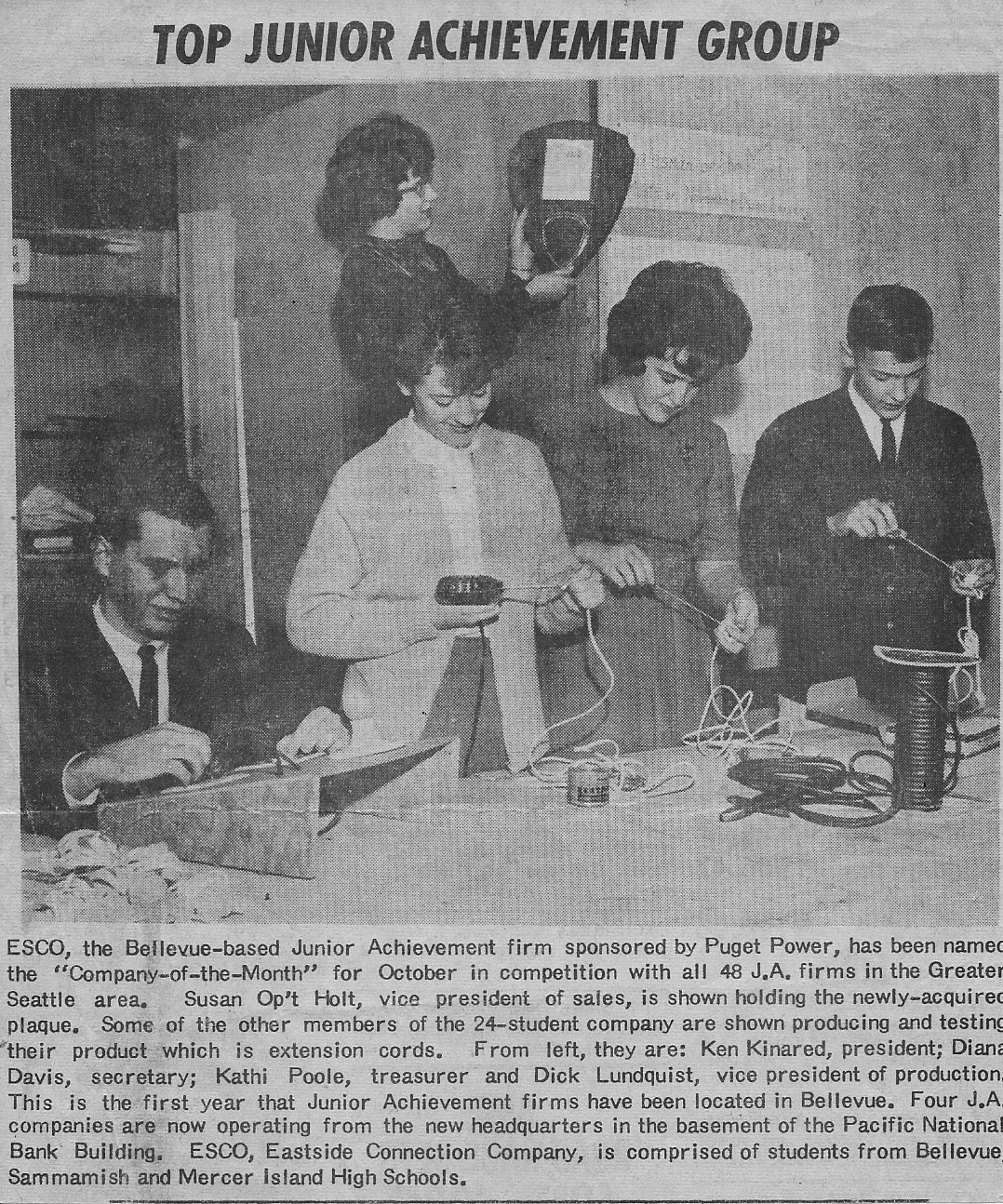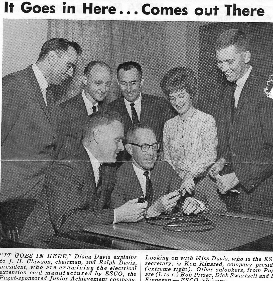 In September, I joined an organization called Junior Achievement, promoted by my Civics teacher, Mr. Keller, whom I admired. A group of teens from both high schools in town were divided into smaller units and mentored to develop businesses. Each unit created a company, sold stock in the company, created a product, marketed and sold the product and, at the end of the year, did a Year End Report that was judged. You could earn scholarships from the efforts you made in your company. Our business, we named ESCO, was sponsored by the local utility Puget Power. We had three advisors. We made and sold extension cords.