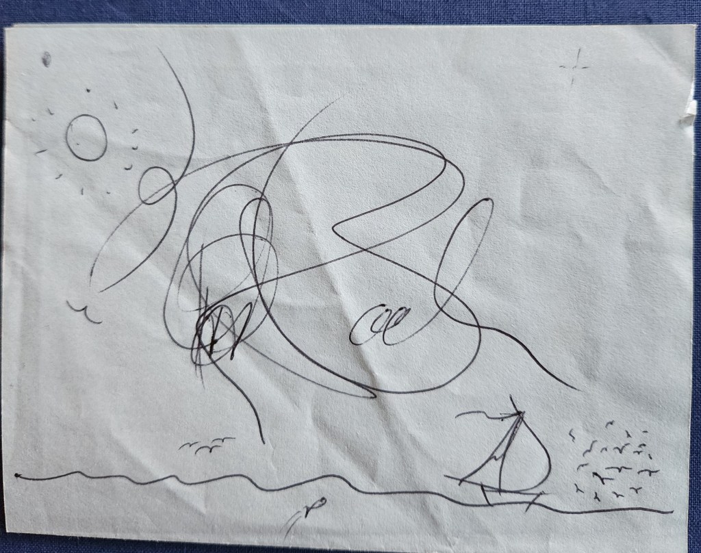 The ride was short and exhilarating. We did loop de loops, barrel rolls, and zig zags. I think my entire flight lasted fifteen minutes and my heart soared. When we were back on the ground, he hopped out of the plane and helped me down. He shook my hand, and I thanked him, utterly starstruck. Then I told him I read his book but forgot to bring it for an autograph. He reached into an inside pocket of his leather jacket and pulled out a piece of blue paper. He tore it in half, took out a pen, drew a picture, and signed his name. “Here,” he said. “Paste this inside the cover of your book.”
